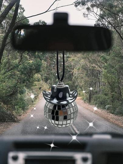 1pc Car Rearview Mirror Decorative Pendant With Disco Ball And Cowboy Hat Design - Black and White - View 1