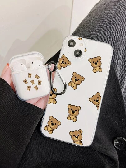 1pc Cartoon Bear Phone Case & 1pc Clear Case Compatible With Airpods - Multicolor - View 1