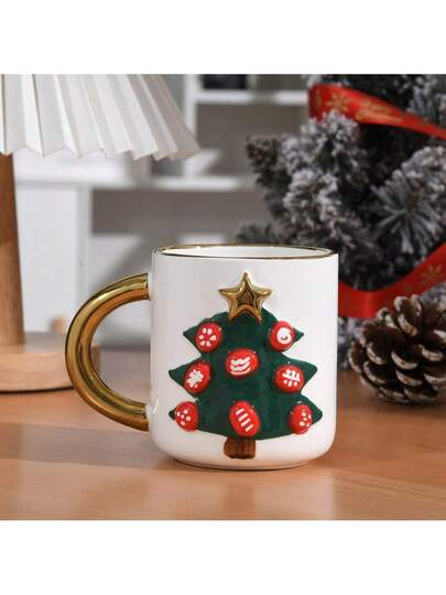 1pc Cartoon Ceramic Christmas Tree Pattern Mug With Gold Rim, No Lid, Couple Breakfast Cup - Green - View 1