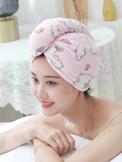 1pc Women's Cute Coral Fleece Wash Hair Cap, Absorbent,Dry Fast, Soft, No Lint, Strawberry/Bear/Bunny/Heart Shaped Printed Shower Cap - Pink - View 1