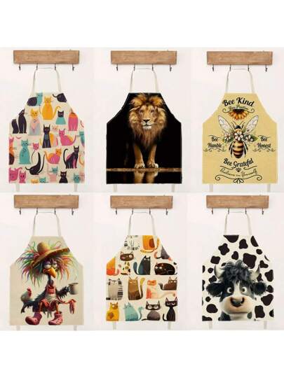 1pc Cat, Cow, Lion 3D Pattern Linen Apron For Home Cooking, Kitchen Wear, And Cooking Enthusiasts - Multicolor - View 1