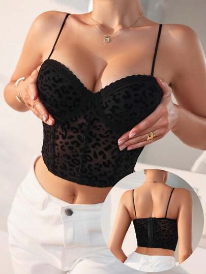 1pc Comfortable Seamless Elastic Lace Cute Bra Top, Lingerie, Cheetah Print Top - Black - View 1