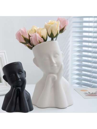 1pc Creative Ceramic Portrait Vase With Hand Supporting Chin Home Decor Room Decor Flower Vase Glass Vase - Black - View 1