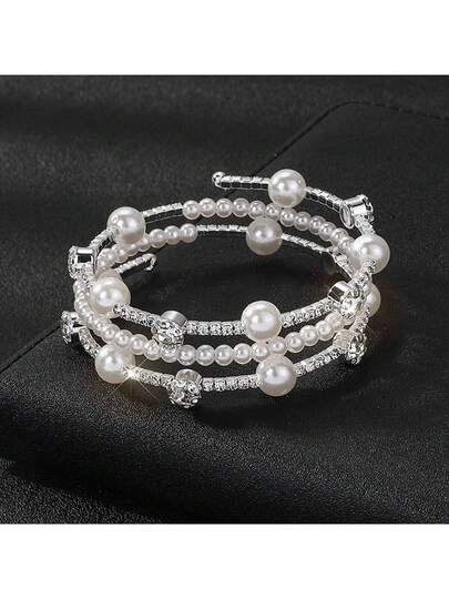 1pc Cross-Border Elastic Multilayer Bracelet Of Pearls And Rhinestones, Wrapping Bracelet Of Pearls And Rhinestones With Waterdrrops For Women - Silver - View 1
