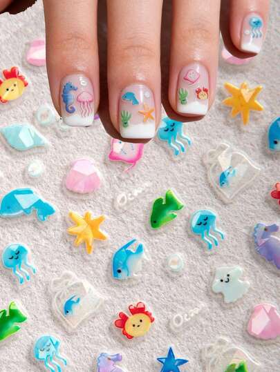 1pc Cute Graffiti Cartoon Ocean Creature Pattern Nail Art Sticker, 5D Embossed Crystal Diamond Nail Sticker, Art Decal Design, DIY Nail Decoration, Phone Case Decor, Scrapbooking - Multicolor - View 1