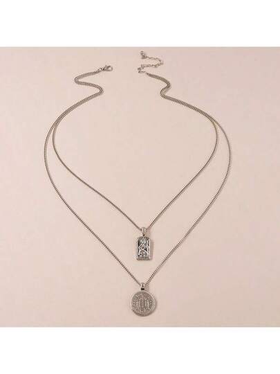 1pc Double Layer Metal Coin Necklace, Suitable For Daily Wear - Silver - View 1