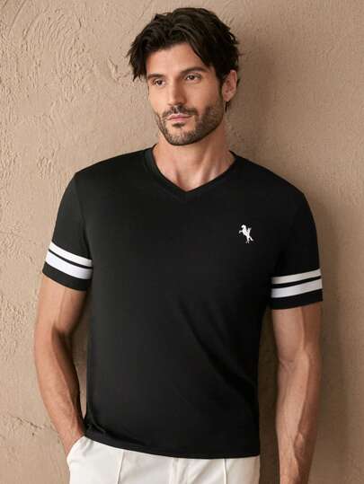 Manfinity VCAY 1pc Men's Casual Fitted Ribbed Detail Short Sleeve V-Neck T-Shirt For Everyday Wear - Black - View 1