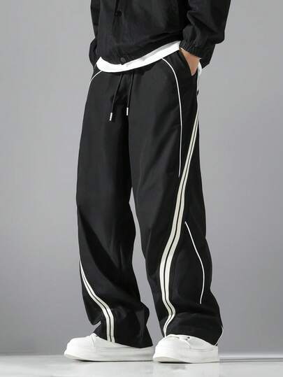 1pc Men's Fashionable Casual Straight Leg Pants, With Stylish Ribbed Tape Decoration, Contrast Color Binding Design - Black - View 1