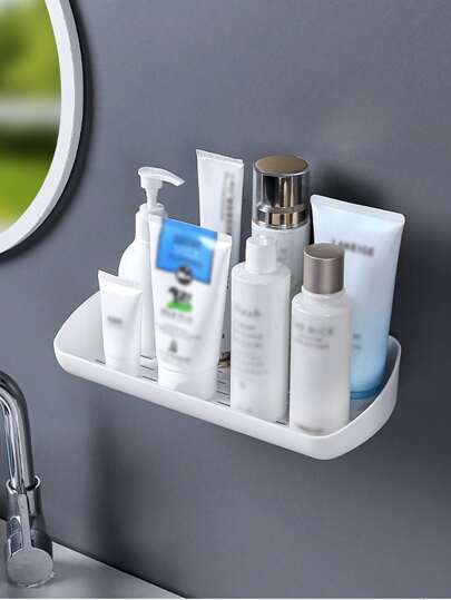 1pc Plastic Bathroom Storage Rack, White Rectangle Punch-free Wall Mounted Shelving Storage Unit For Bathroom Laundry - White - View 1