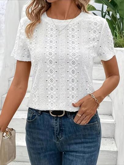 1pc Plus Size Ditsy Floral Embroidered Sheer Loose Knit Fabric T-Shirt, Comfortable For Summer, Machine Washable - White - View 1