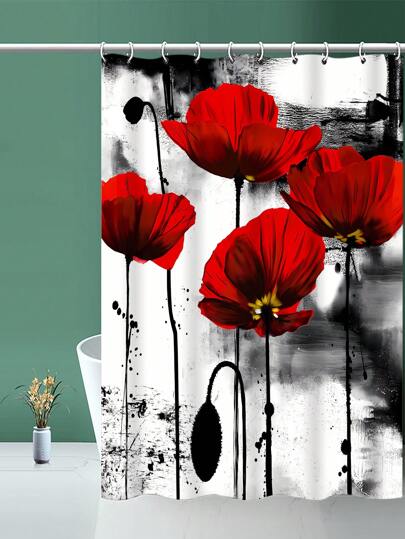 1pc Polyester Waterproof Shower Curtain With Red Ink Flowers Print Bathroom Curtain - Multicolor - View 1