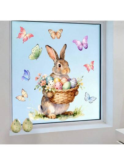 1pc Rabbit Holding Colorful Eggs Basket Window Cling Decal, Includes Flower & Butterfly Patterns, Removable Static Cling Glass Sticker, Suitable For Easter Bedroom Living Room Entryway Decoration - Multicolor - View 1