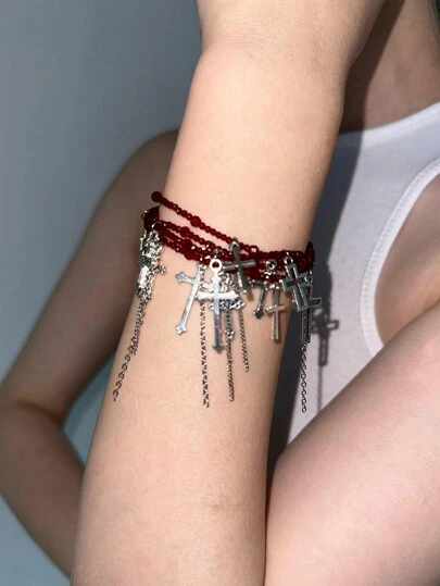 1pc Retro Gothic Cross Black Punk Tassel Multi-Layer Bracelet - Antique Silver - View 1