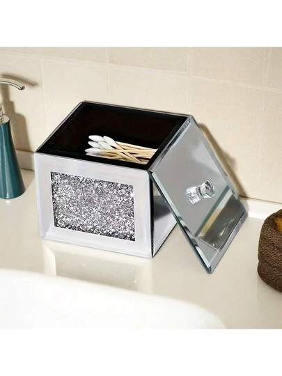 1pc Rhinestone Mirror Glass Desktop Storage Box - Covered Dust-Proof Jewelry Box | Hair Clip & Tie Organizer | Toothpick Box | Crystal Cleaning Wipe Box - Silver - View 1