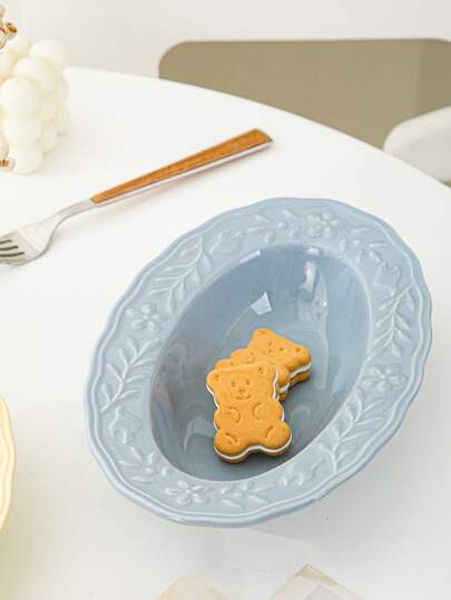 1pc Scroll Detail Plate, Nordic Leaf Design Oval Shaped Food Plate For Dinner Table - Blue - View 1