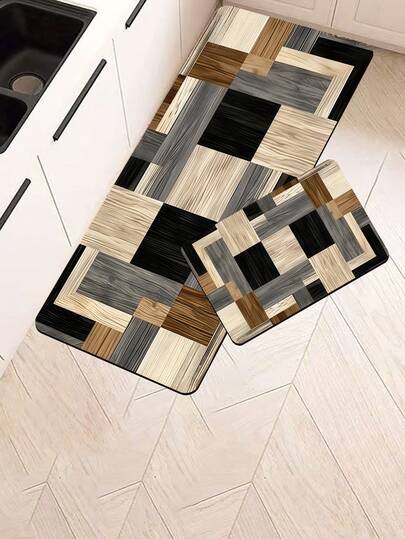 1pc Soft Velvet Faux Woodgrain Patchwork & Plaid Print Kitchen Rug/Mat, Dirt Resistant, Machine Washable, Suitable For Kitchen, Study, Hallway And More Scenarios - Multicolor - View 17