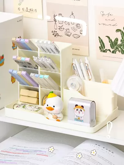 1pc Solid Color Stationery Storage Box, Simple Multi-purpose Desk Holder For Office, School, Student - White - View 1