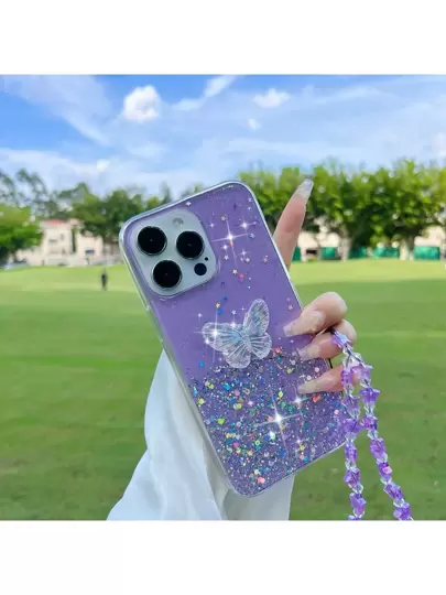 Valentines Phone Case With Card Holder With Phone Charm 1pc Sparkling Glitter Crystal Butterfly & Stars Design Phone Case With Hand Strap - Purple - View 1