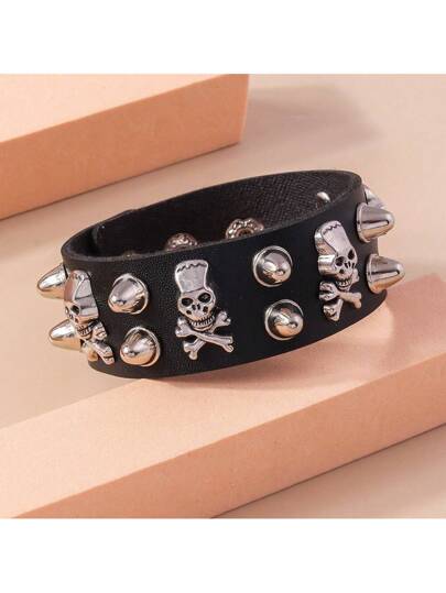 1pc Unisex Gothic Style Skull Head & Rivet Decorated Pu Leather Bracelet For Couples, Y2k Style - Black - View 1