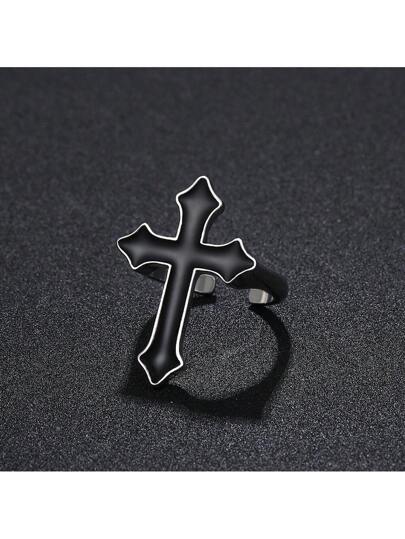 1pc Vintage Black Large Cross Open Ring, Gothic Style Alloy Men's Halloween Ring - Antique Silver - View 1