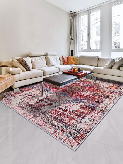 1pc Vintage Style Worn-out Rug, Comfortable And Washable Polyester Rectangle Carpet For Living Room And Bedroom - Multicolor - View 7