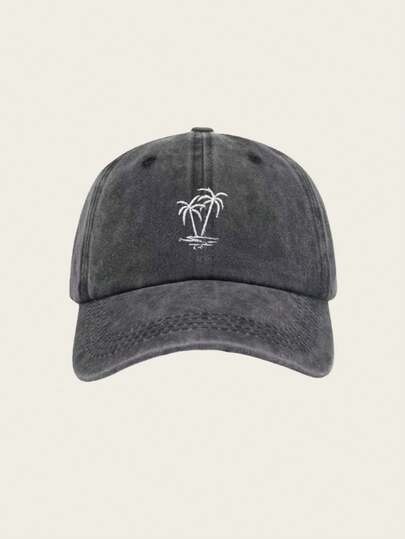 1pc Washed Vintage Baseball Cap With Embroidered Coconut Tree Pattern, Retro Soft Crown Sun Hat, Unisex Fashionable Solid Color Brim - Black - View 1