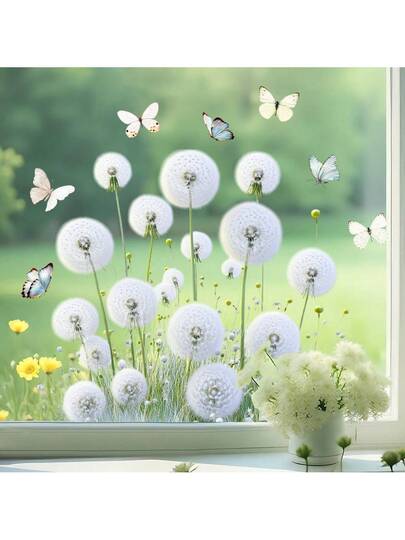 1pc White Dandelion Floral Butterfly Glass Sticker, Room Window Decor PVC Static Cling Sticker, Butterflies Dancing, Fresh And Natural Vibe, Attractive Sticker - Approximately 30cm Wide and 40cm Long - View 1