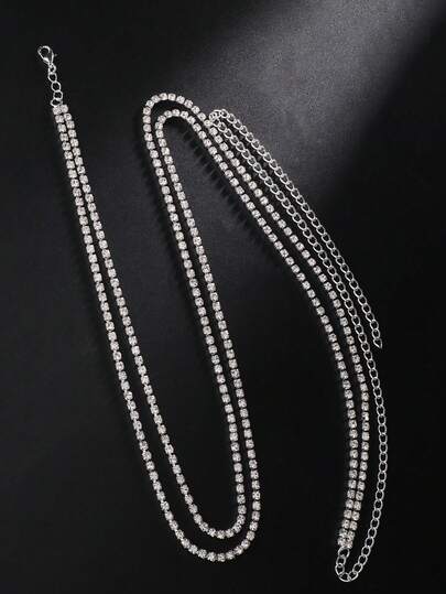 1pc Women's Silver Crystal Rhinestone Double Layer Waist Chain - Silver - View 1