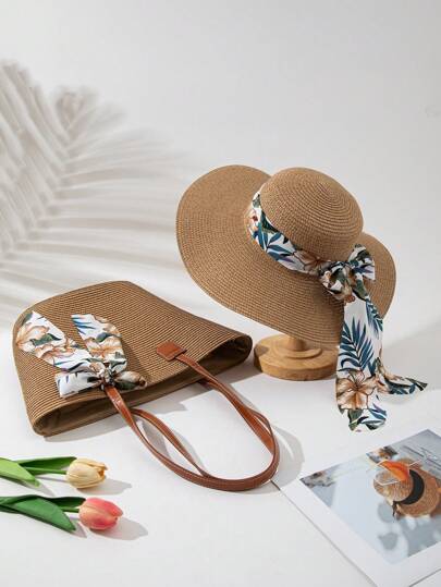 1pc Women's Boho Tropical Plants Printed Hat + 1pc Matching Handbag, For Holiday/Vacation - Khaki - View 1