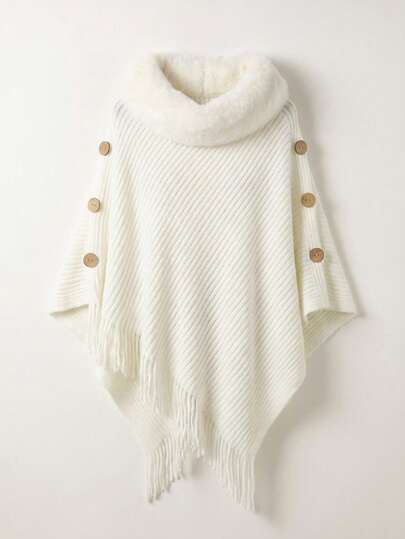 1pc Women's Solid Color Fringe Collar Triangular Knit Warm Shawl Poncho, Fashionable Casual For Holiday And Daily Use - Multicolor - View 1