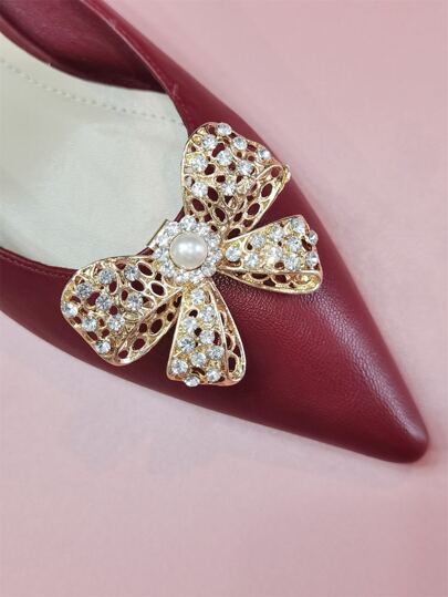 1pc Zinc Alloy Shoe Decoration, Rhinestone & Faux Pearl Decor Bow Design Glamorous Accessories For Pumps - Gold - View 1