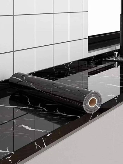 1roll Marble Pattern Waterproof Self-Adhesive Kitchen Sticker, Stickers, Wall Decal, Vinyl Decal For Home Decorations, Spring Decoration Items Refresh Your Home, Festival Decoration Stickers Gifts Birthday Graduation - Black - View 1