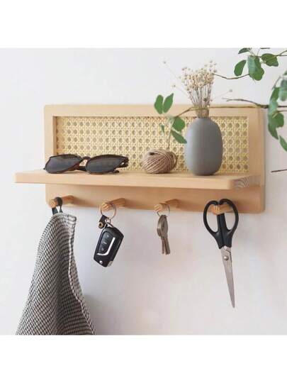 1set Wall-Mounted Storage Rack With A Simple Style, Made Of Rattan And Wood With Holes For Installation, Is Used For Home Storage And Decoration. - Multicolor - View 1
