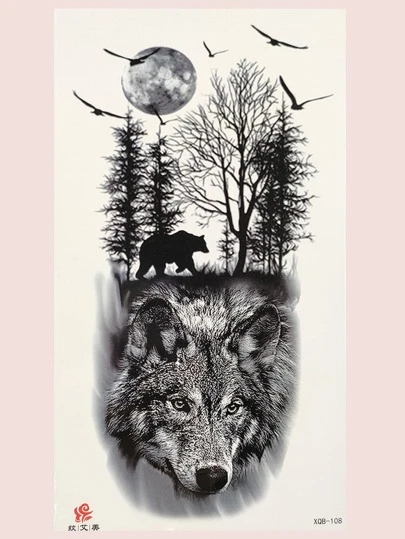 1sheet Wolf & Bear Pattern Tattoo Sticker - Black - View 1