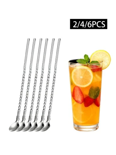 2/4/6pcs Stainless Steel Reusable Straw Spoon Suitable For Milk Tea, Coffee, Juice And Other Beverages - Silver - View 1