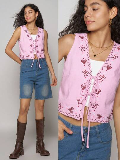 Easelle 2025 New Arrival Holiday Summer Red Embroidery Embroidered Tops Lace Up Tops Vacation - Pink - View 1