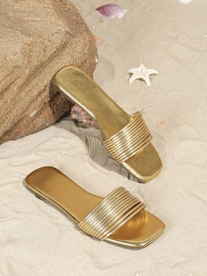 2025 Summer New Arrival, Ladies Flat Sandals With Square Toe, Stripe Simple Style, Gold Color - Gold - View 1