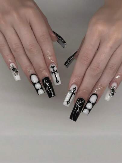 24Pcs Black Coffin Nails With Leopard Print, Asymmetrical Lines, Rhinestones And Starry Design, Full Coverage Removable False Nails, Suitable For Women Daily And Party Wear Press On Nails Nail Supplies Nails - Multicolor - View 1