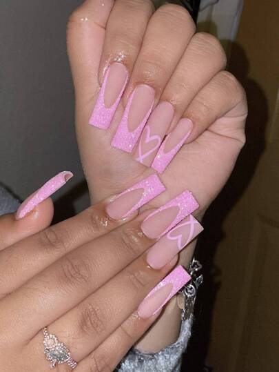 24pcs Coffin Shaped Pink With Glitter & Heart French Edge Fake Nail Tips With Nail File & Jelly Glue Press On Nails Nail Supplies - Pink - View 1