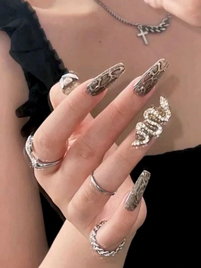 24pcs Long Coffin Snakeskin Pattern Fake Nail & 1sheet Tape & 1pc Nail File - Multicolor - View 1