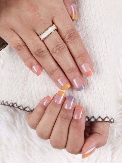 Upgrade Your Look with 24pcs Long Square French Colorblock Fake Nail & 1pc Nail File & 1sheet Tape For women And Girls - Multicolor - View 1