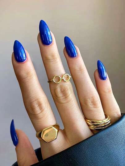 Instantly Upgrade Your Look with 24pcs Short Almond Blue Solid Color Glossy Surface Plain Fake Nail & 1sheet Tape & 1pc Nail File - Multicolor - View 1