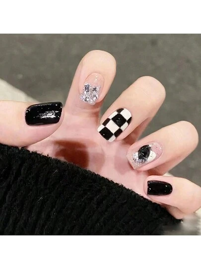 24pcs Short Oval Fake Nails With Simple Black & White Checkerboard & Silver Glitter Decor For Daily Wear - Black and White - View 1