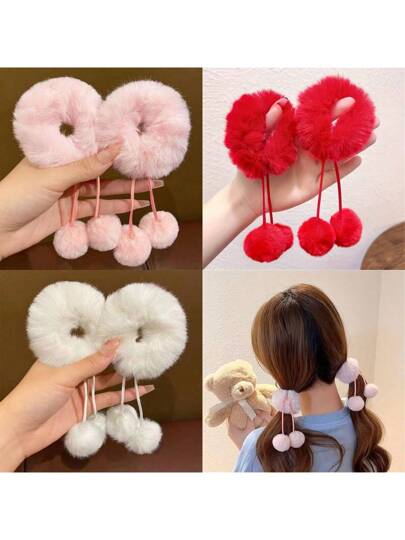 2Pcs Adorable Fluffy Pom Pom Hair Ties - Perfect For Fall And Winter - Suitable For Ages 14 And Up - Set Of 2 - Great For Creating Cute And Sweet Hairstyles Ponytail Holders Hair Elastics Hair Rubber Bands Scrunchies Hair Rope Elastic Hair Tie - Multicolor - View 1