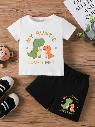 2pcs Baby Boy Animal & Letter Print Short Sleeve Top And Shorts Set, Summer - Black and White - View 1