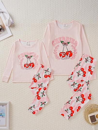 2pcs Tween Girls Cute Cherry Print Ribbed Snug Fit Long Sleeve Pajamas Set - Pink - View 1