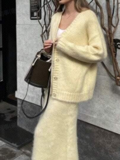 INAWLY 2pcs Elegant V-Neck Knitted Sweater Set, Autumn/Winter - Yellow - View 1