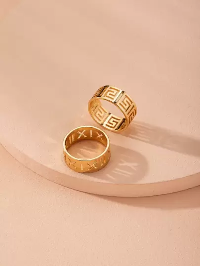 2pcs Hollow Out Letter Decor Ring Copper Jewelry - Yellow Gold - View 1