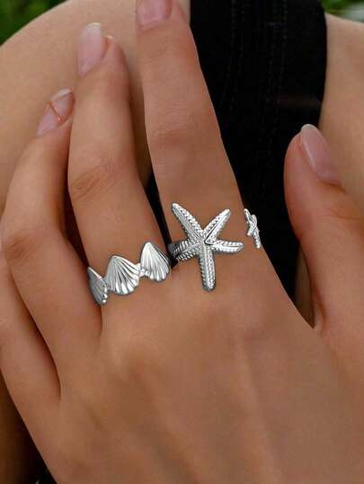 2pcs Metal Ocean Series Rings Set, 3D Starfish And Shell Adjustable Rings For Women, Suitable For Ball, Party, Holiday Wear, Girlfriends' Date Gift - Silver - View 1
