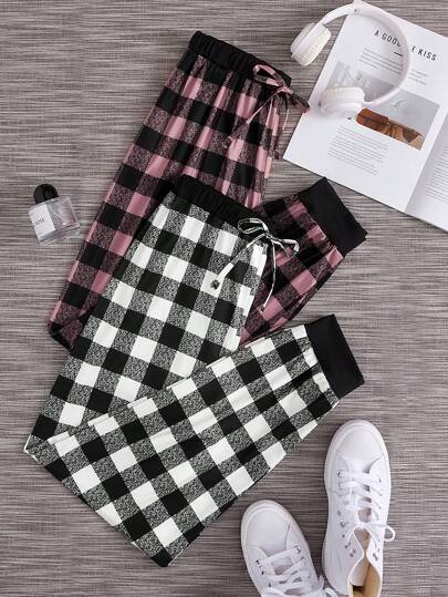2pcs Plaid Print Tie Waist Pajama Sleep Pants, Fall Winter Clothes - Multicolor - View 1